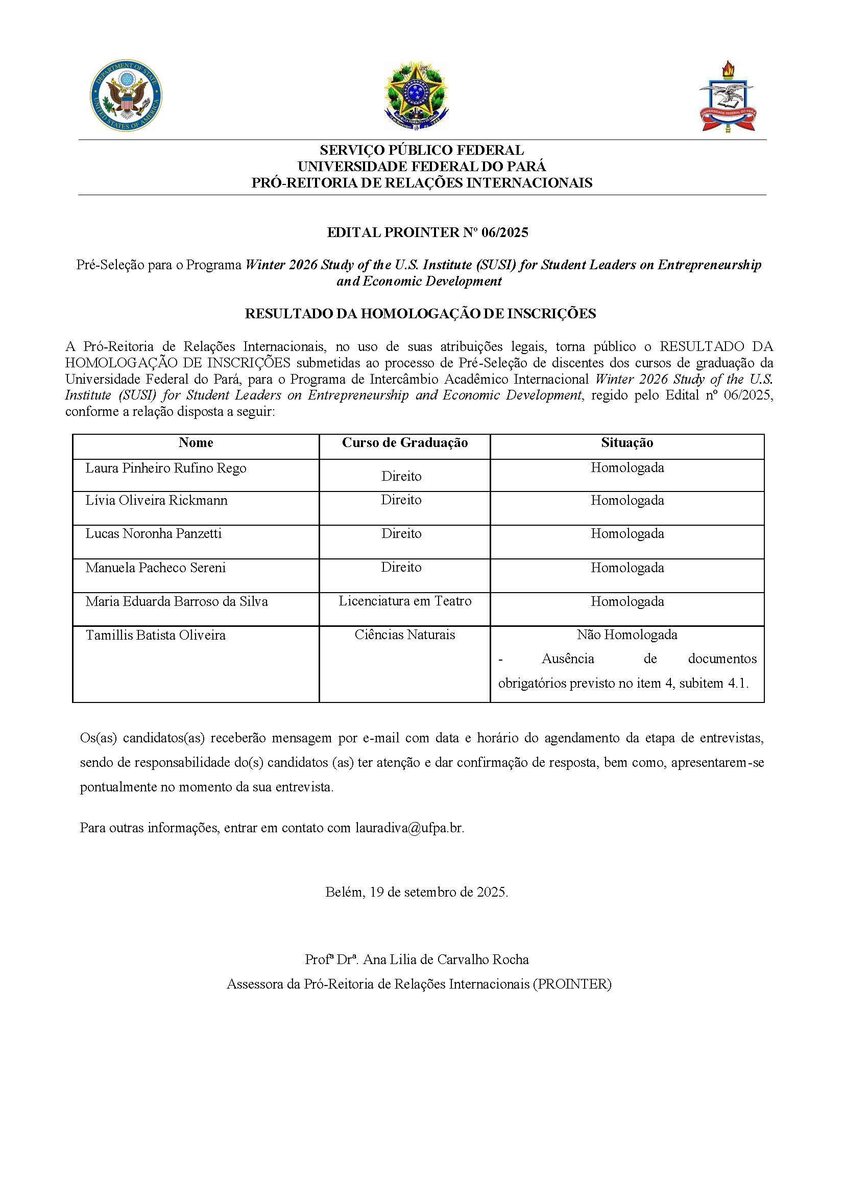 A Pró-Reitoria de Relações Internacionais (PROINTER) da UFPA torna pública a homologação do resultado final da pré-seleção para o programa de intercâmbio Study of the U.S. Institute (SUSI) for Student Leaders on Entrepreneurship and Economic Development.