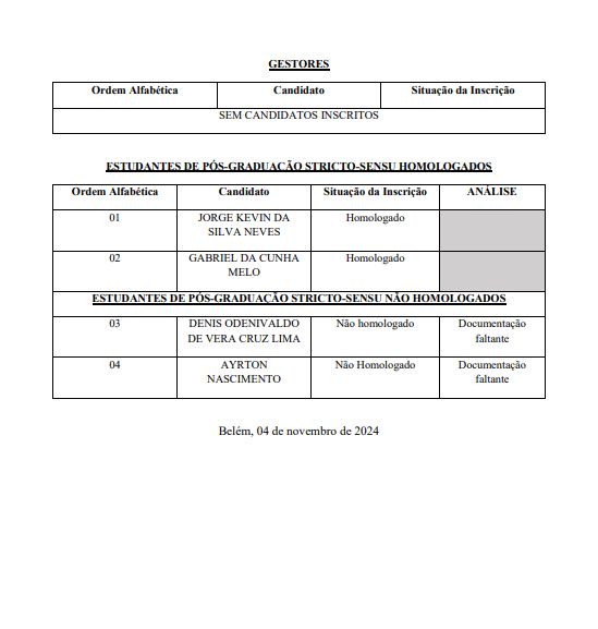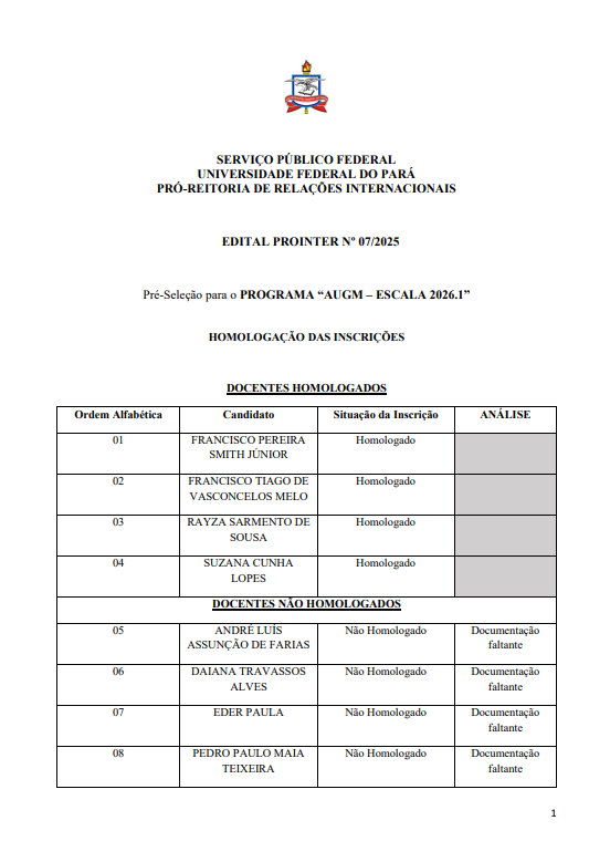 A Pró-Reitoria de Relações Internacionais (PROINTER/UFPA) divulga a lista de Homologação das Inscrições referente à Pré-Seleção para o PROGRAMA "AUGM - ESCALA 2026.1" , conforme o Edital PROINTER Nº 07/2025. O documento detalha os candidatos das categorias Docentes e Estudantes de Pós-Graduação Stricto-Sensu que tiveram suas inscrições homologadas, bem como aqueles que foram não homologados por pendência ou documentação faltante. Informa-se que a divulgação deste resultado ocorreu em data posterior à prevista no cronograma devido a instabilidades no sistema.