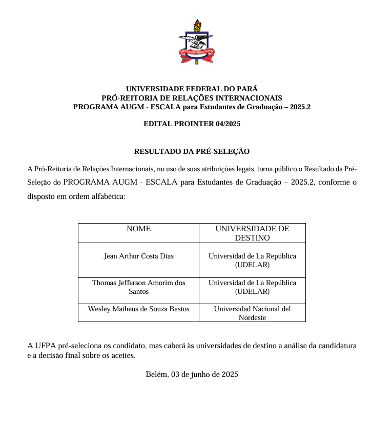 Página inicial > Editais > RESULTADO DA PRÉ-SELEÇÃO- Programa Escala AUGM de Graduação 2025.2 RESULTADO DE AVALIAÇÃO DOCUMENTAL - Programa Escala AUGM de Graduação 2025.2