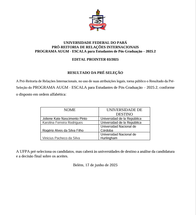 Página inicial > Editais > RESULTADO DA PRÉ-SELEÇÃO- Programa Escala AUGM de Graduação 2025.2 RESULTADO DE AVALIAÇÃO DOCUMENTAL - Programa Escala AUGM de Pós-Graduação 2025.2