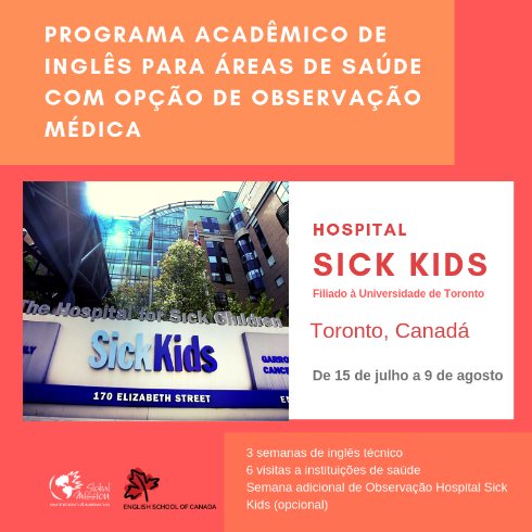 É com muita satisfação que divulgamos a 5ª edição do Programa Acadêmico de Inglês para Áreas de Saúde, com uma Semana opcional de Observação Médica, no Hospital “Sick Kids” de Toronto, com acompanhamento individual e opção de escolha de até 2 das 63 áreas disponíveis para observação. O programa é uma parceria de nosso escritório – Global Mission Intercâmbios – com a English School of Canada. O programa foi montado para atender estudantes e profissionais das áreas de Medicina, Enfermagem, Biomedicina, Nutrição, Fisioterapia, entre outras áreas da saúde.